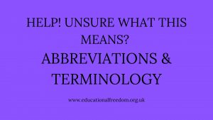 There are a huge range of abbreviations and terminology, many new and changing, to learn and understand when you decide to Home Educate, it can also throw some of us who have been home educating long term too. Just to add to this and make it more confusing are the shortening or abbreviated versions of terms floating around which up until now you have probably never heard of. We have built a glossary here of some of the more common abbreviations and terminology’s used in the world of home education to give you a helping hand.