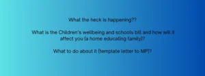 I am writing to you today with a matter of utmost urgency as the Children’s wellbeing and schools bill is due a second reading on the 8th January. I am asking for your support to ask questions of the government, and for your help getting the government to see that the wording of the bill is dangerous, not fit for purpose and will do irreparable damage to home educators like myself and 80k+ home educated children in England.